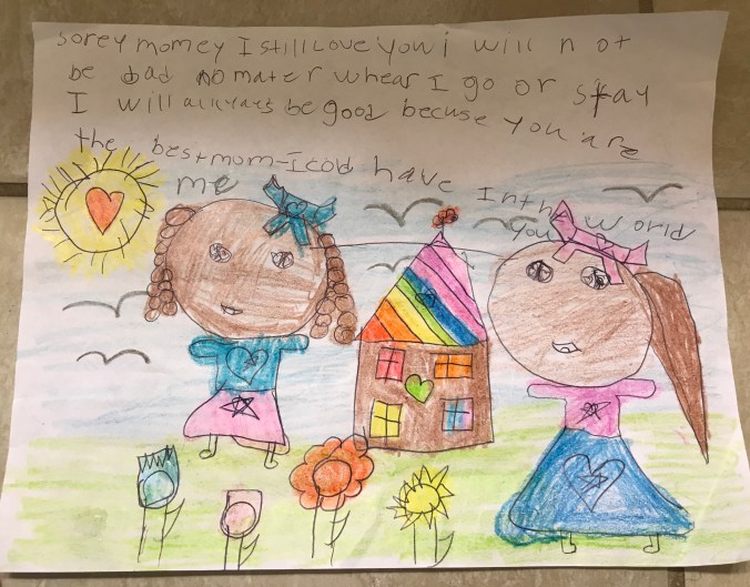 I want to share with you a drawing I received from my 6-year-old daughter. My daughter knew she upset me with her behavior so in addition to verbally apologizing to me she decided to draw a picture and let me know she was truly sorry. I really appreciate the time she took to neatly color the picture and to put in lots of details to express her sorrow to me. It indicates her respect for me and my feelings. These things are my sweet treasures because it is one way that lets me know that I’m doing a great job as a mom.